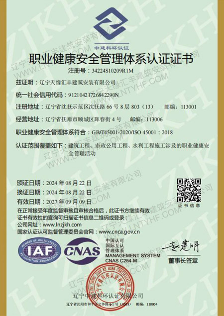 職業(yè)健康安全管理體系認(rèn)證證書